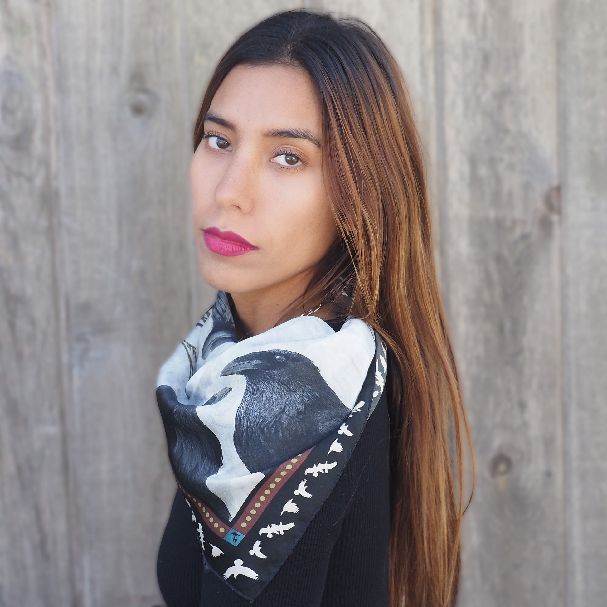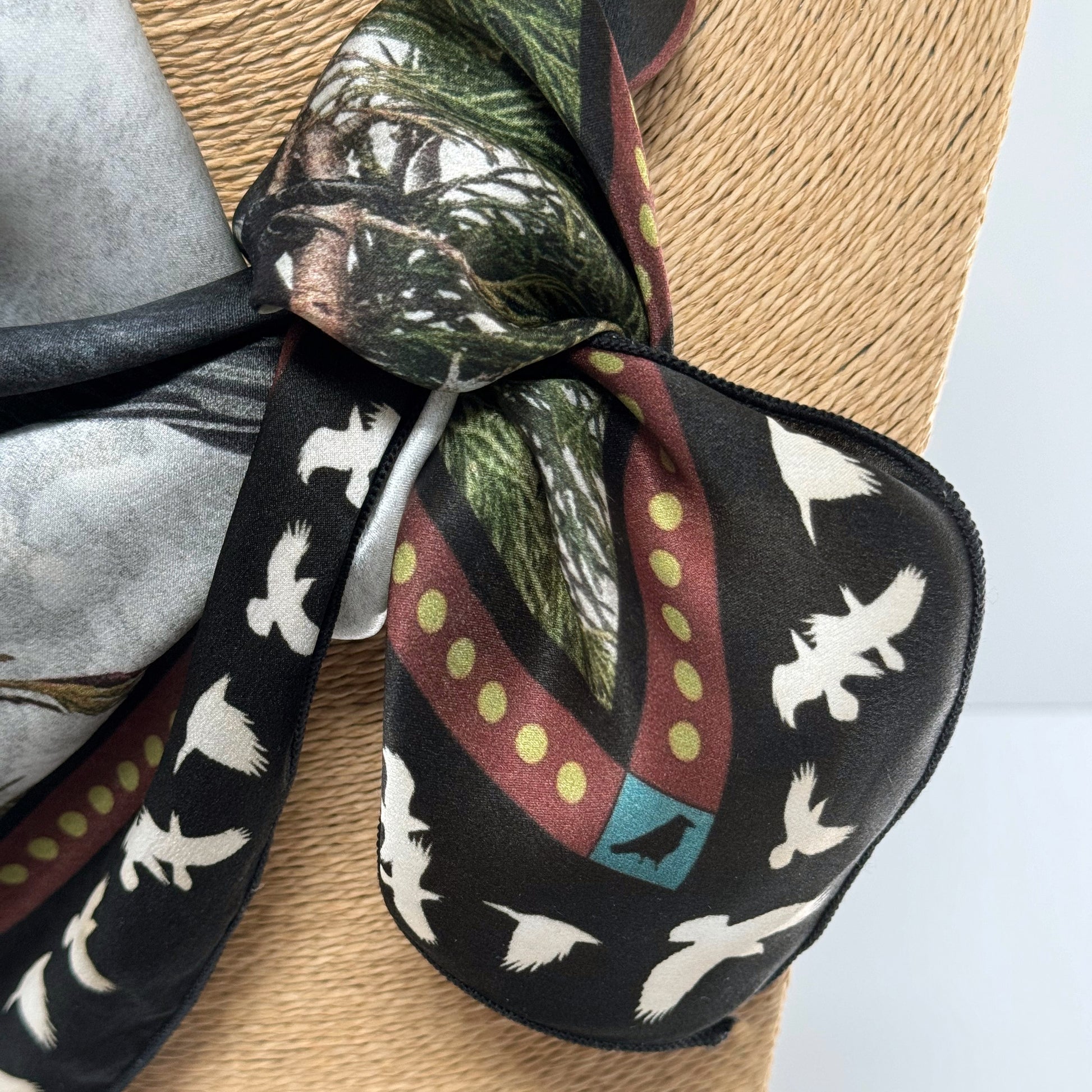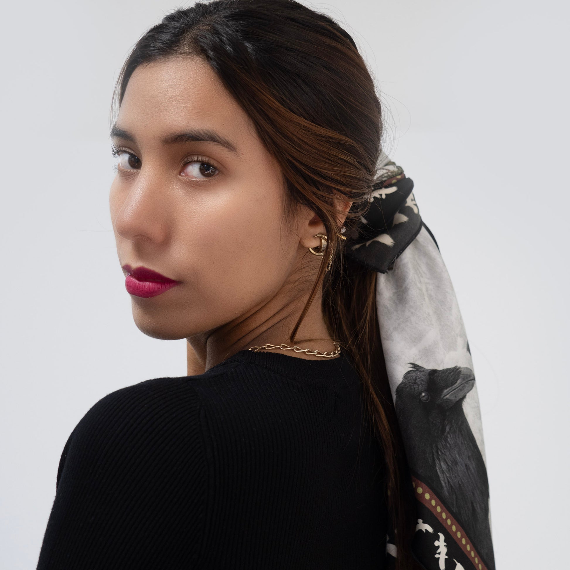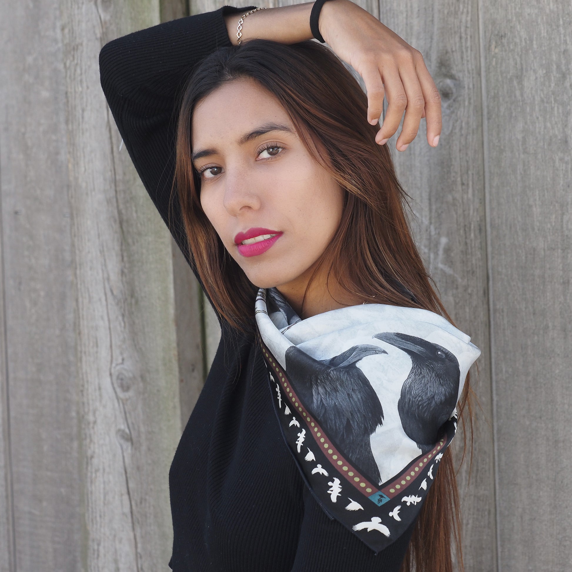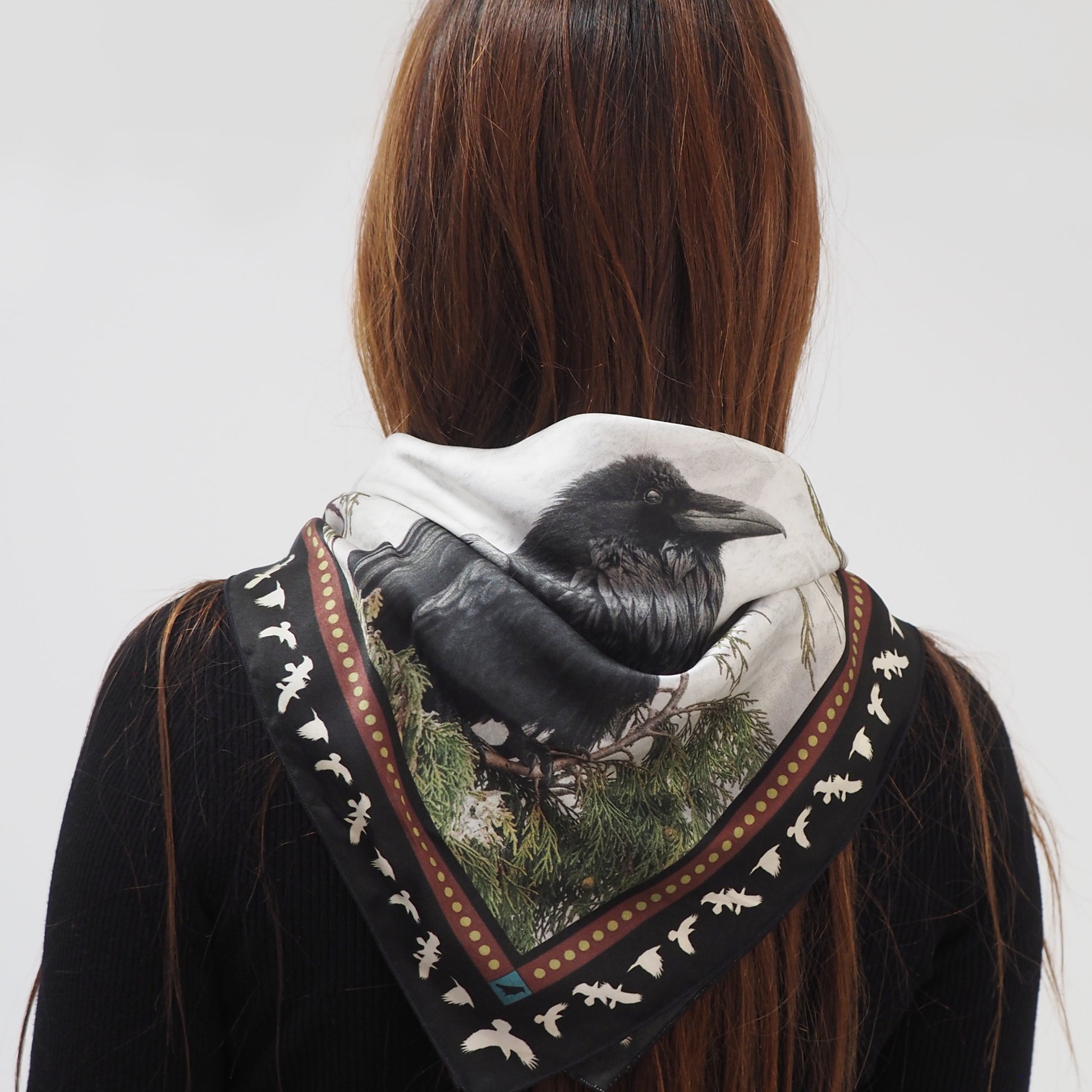 The scarves are all printed and sewn in Montreal using my own raven designs. This scarf is made from 12 mm silk charmeuse fabric, it is shiny on the surface and matte underneath — a perfect mix of durability and beauty. The shine enhances the detail of the images and the fabric drapes beautifully. Silk charmeuse has a luxurious and liquid texture which makes it feel wonderful to wear. It's a natural fabric; breathable and insulating.