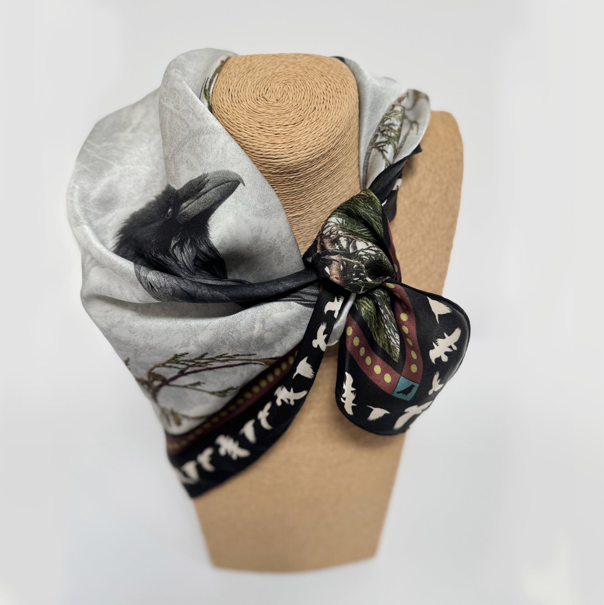 This medium-size silk raven scarf is a wonderfully versatile size. It's perfect tied around the neck and tucked into a jacket to keep the wind at bay; it's can be worn bib-style to add colour and style to the most simple outfit; it's just the right size for a headscarf or hair band; you can tie it to your purse for a little blast of raven joy wherever you go.