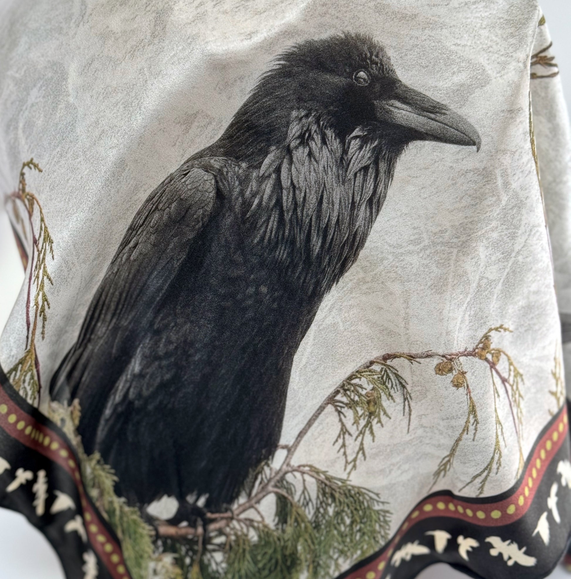 This new silk scarf features details from my own raven portraits combined with cedar foliage and surrounded by an intricate border capturing the energy of ravens on the wing and the colours of the rainforest.