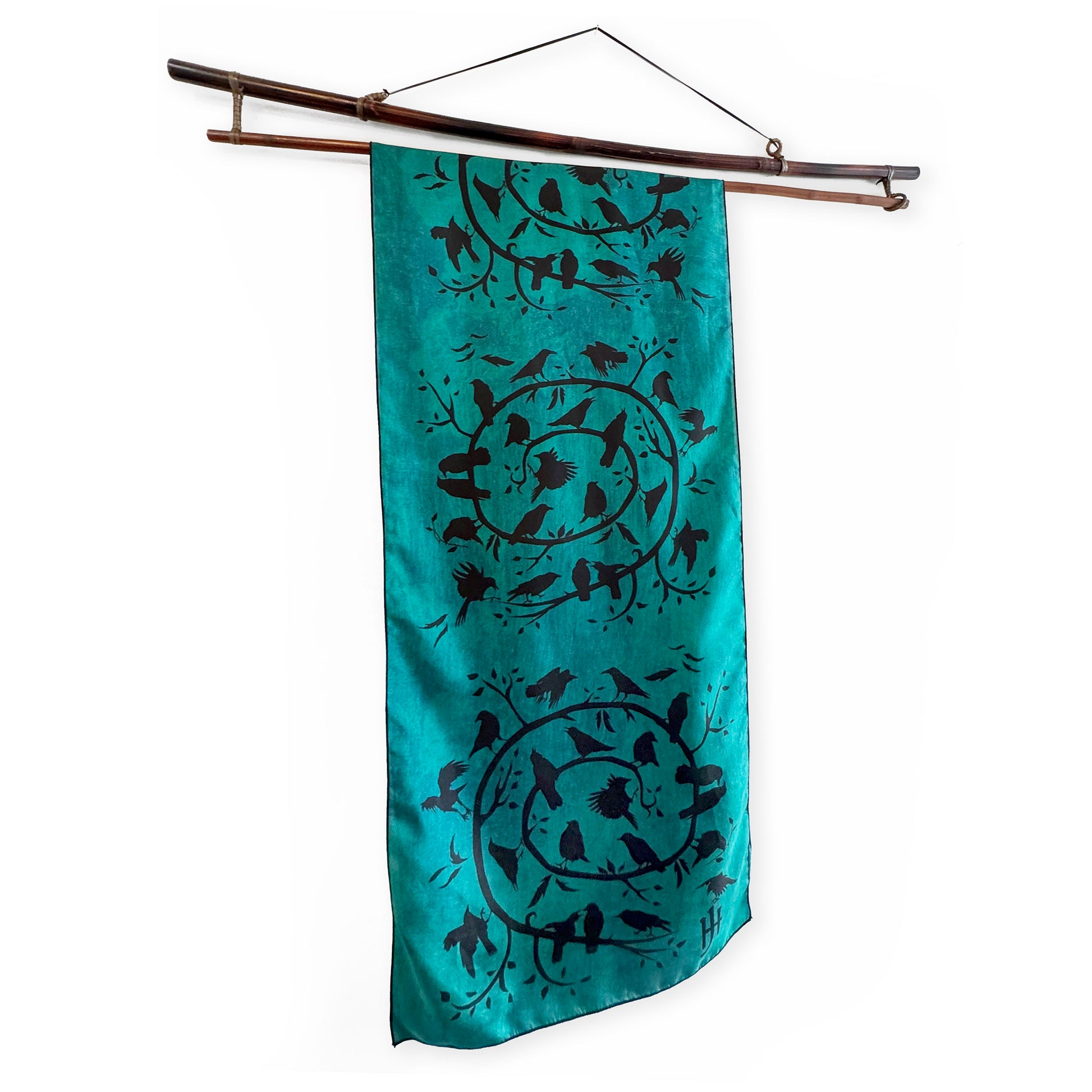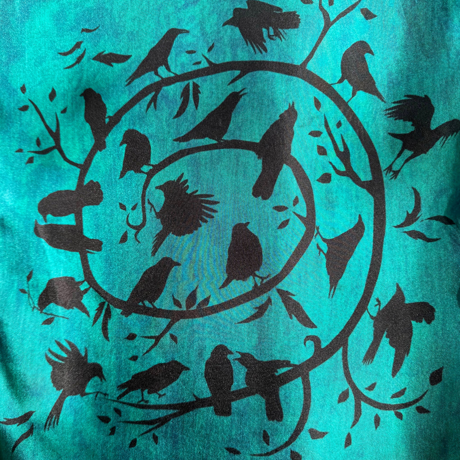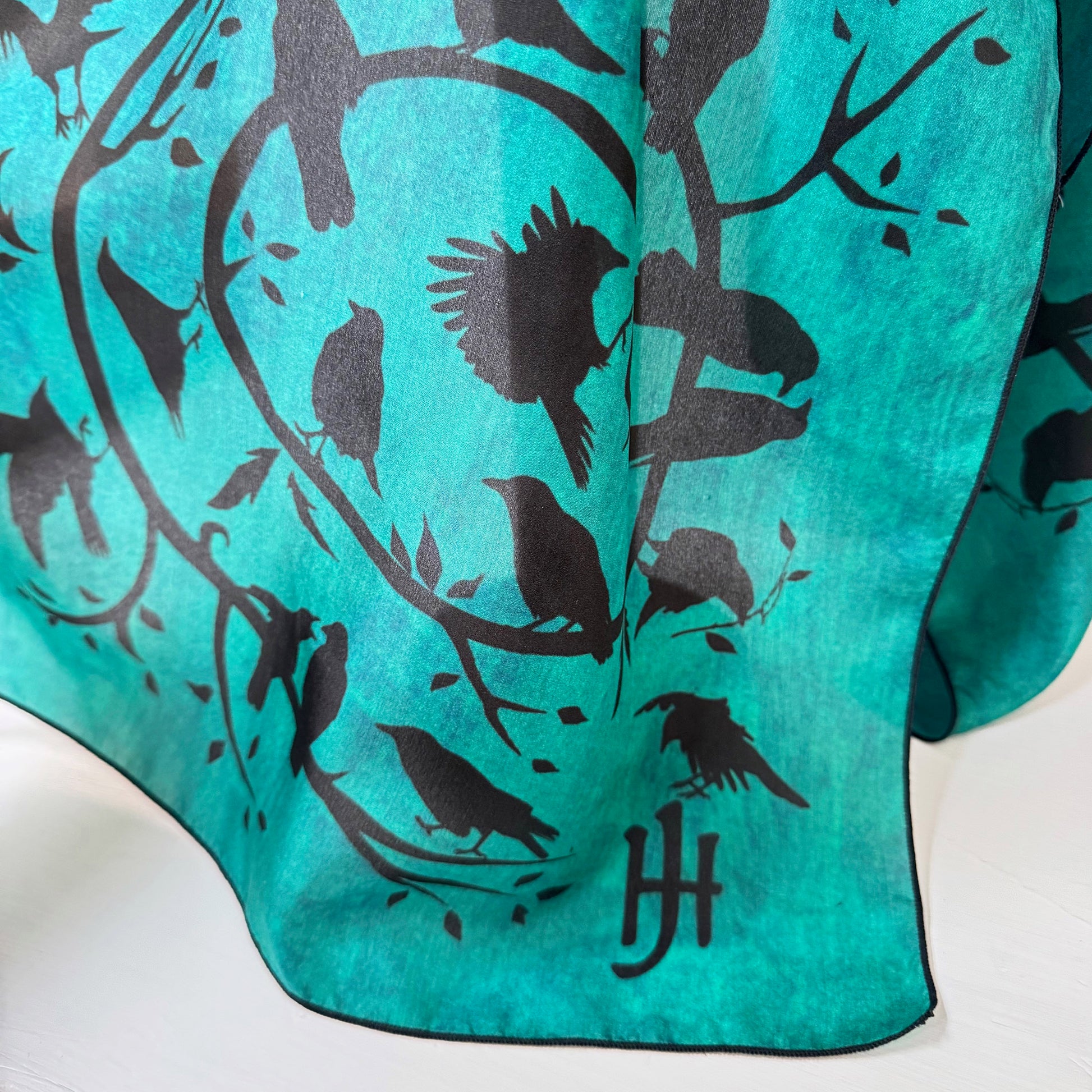 This a summer colour variation on my original Crow Dance Scarf. This new 100% silk crow portrait scarf features the same spirals of dancing crows, this time in black and swirling against an eye-catching background of saturated teal enriched with indigo textures.