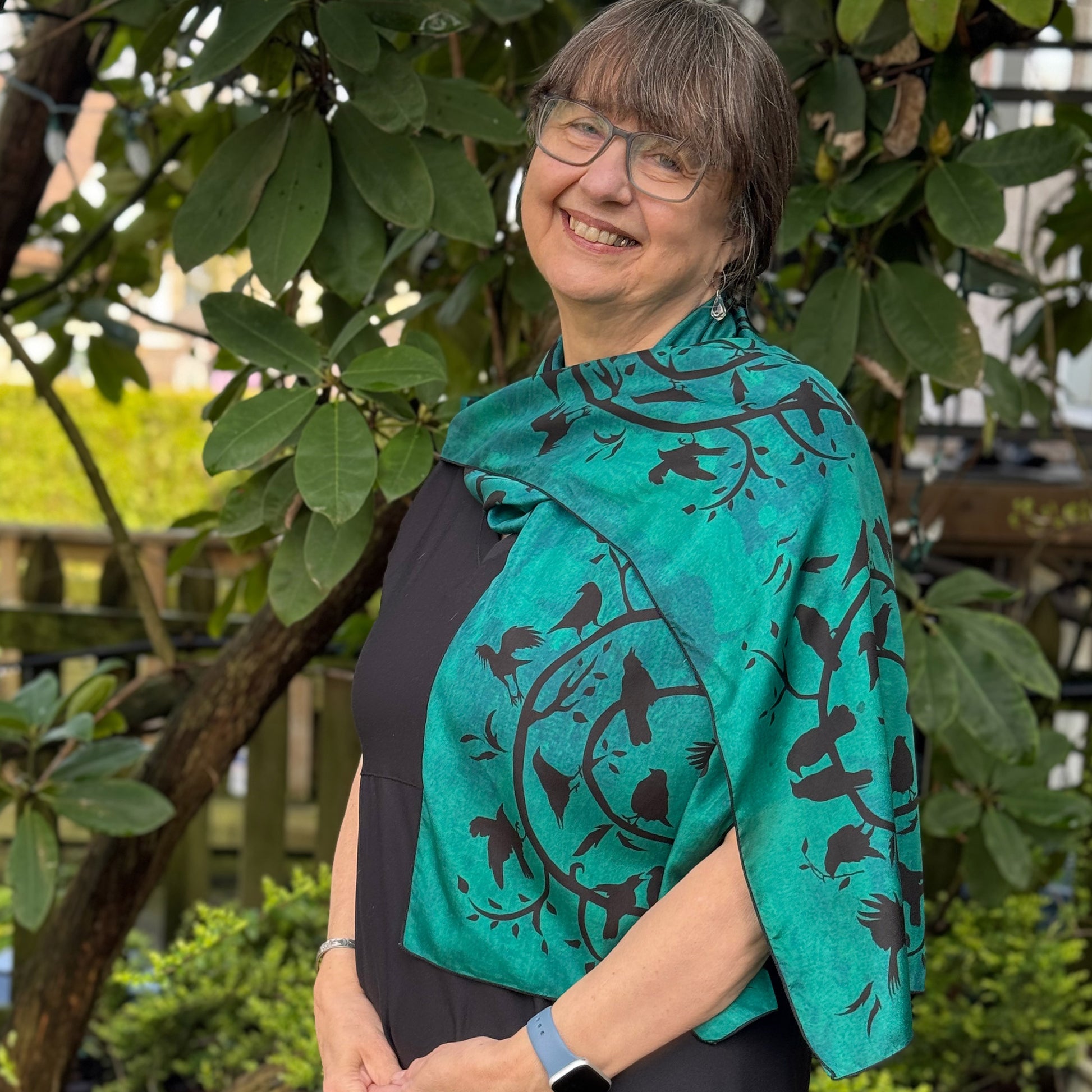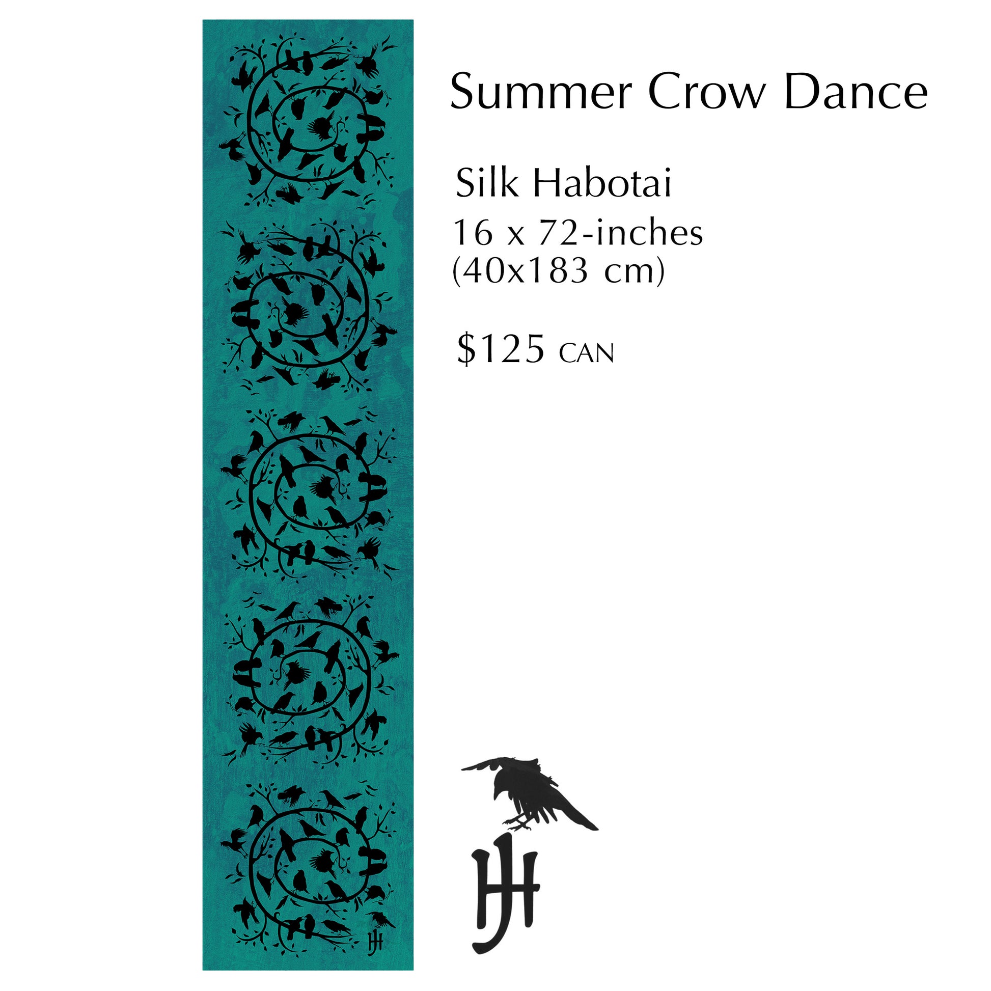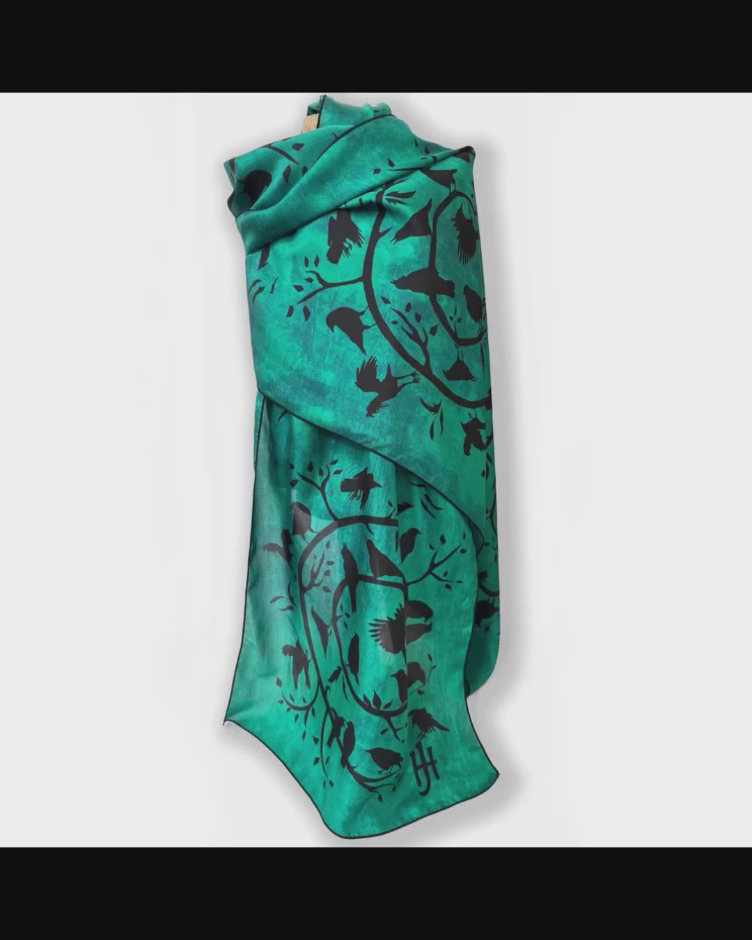 This a summer colour variation on my original Crow Dance Scarf. This new 100% silk crow portrait scarf features the same spirals of dancing crows, this time in black and swirling against an eye-catching background of saturated teal enriched with indigo textures.