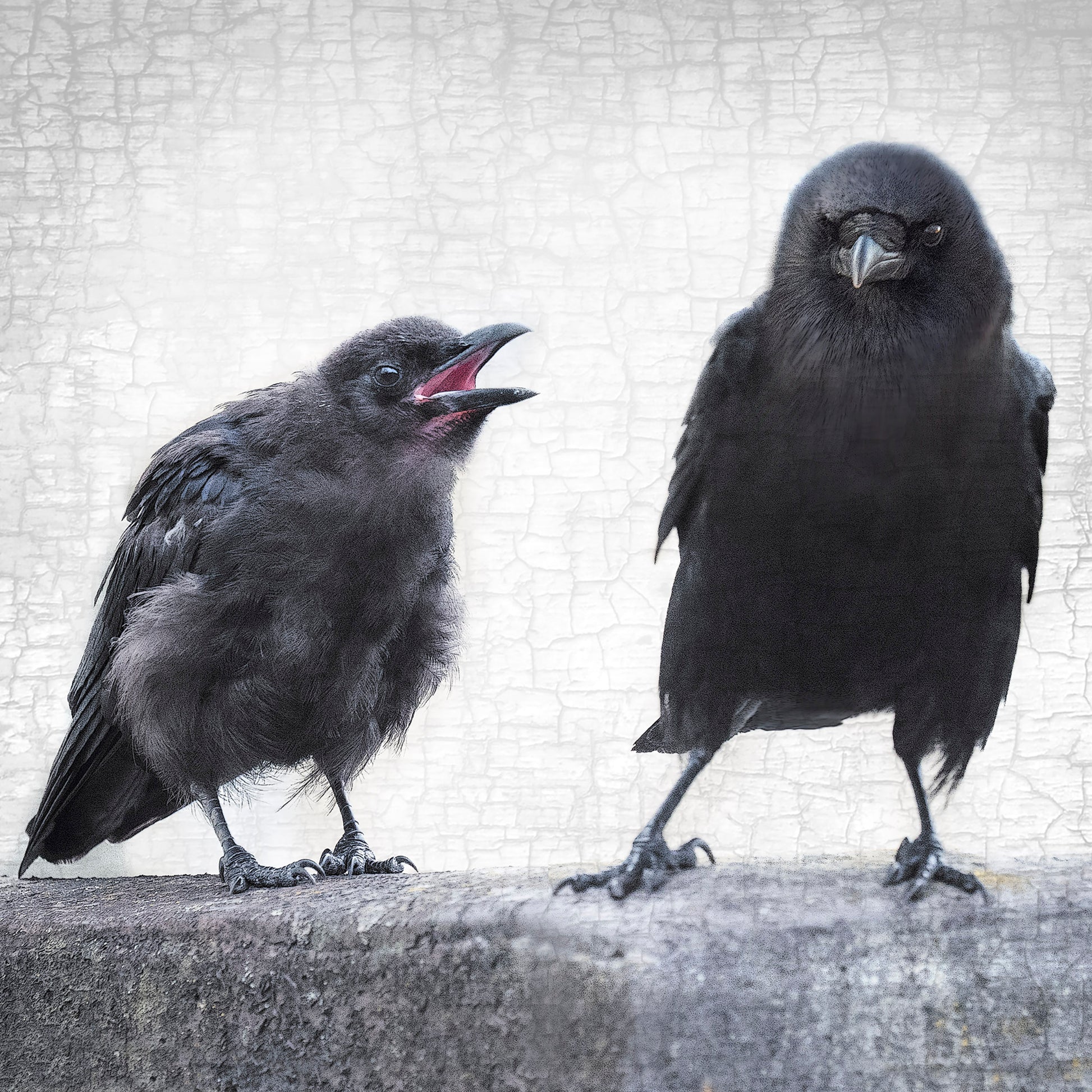 In this photograph, you are introduced to Mabel, a crow with a long and well-loved story, and her hungry fledgling.