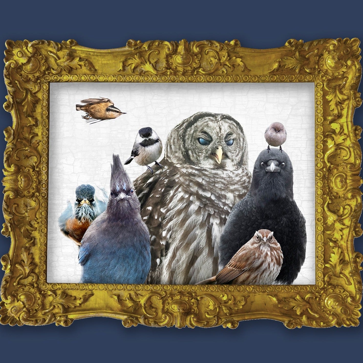 The Birds of Judgment include (L to R) Red Breasted Nuthatch, American Robin, Steller's Jay, Black Capped Chickadee,  Barred Owl, Crow, Bushtit and Song Sparrow.