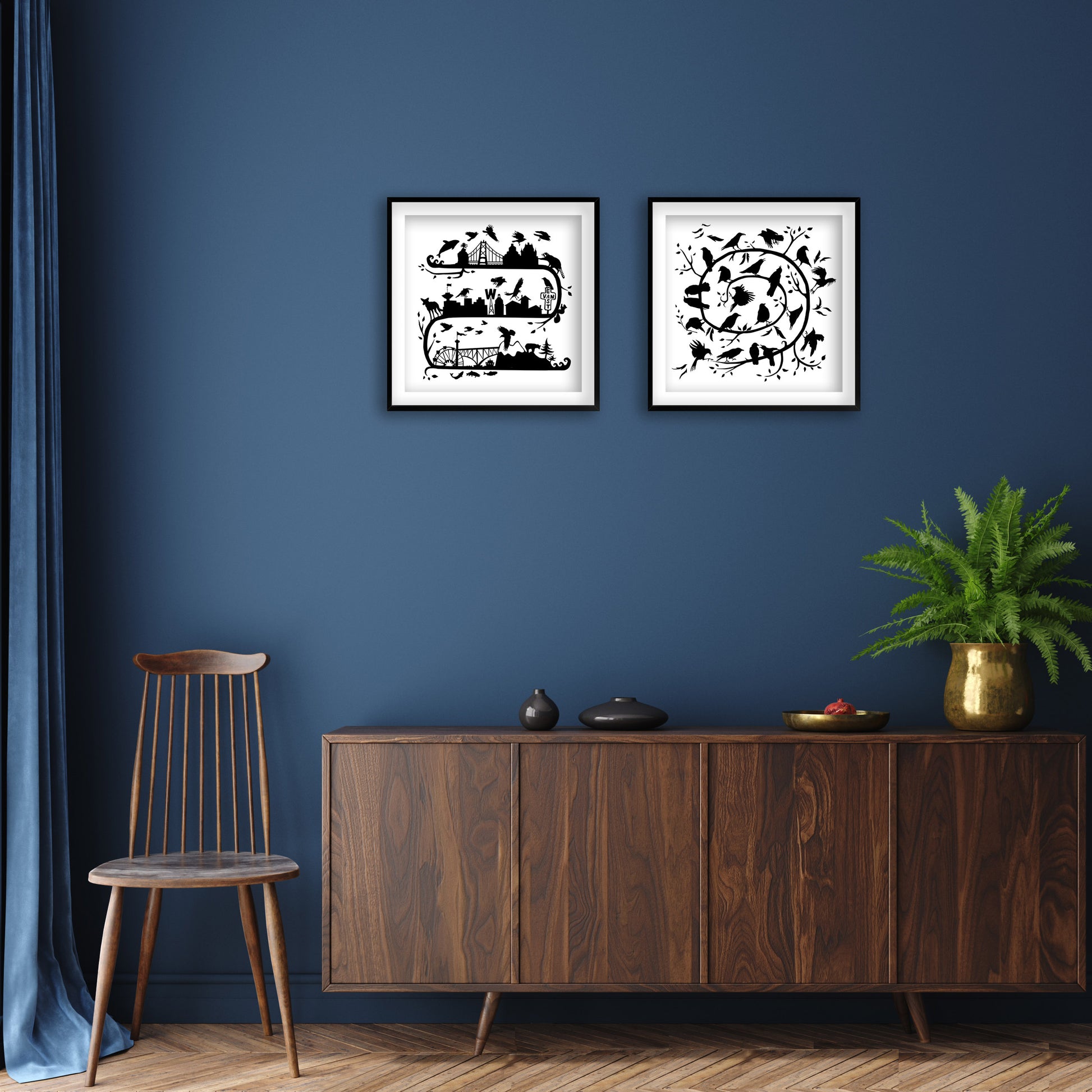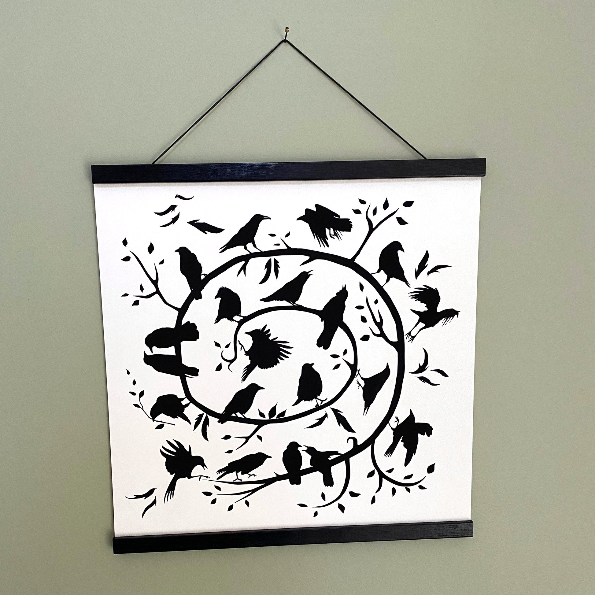This crow art aims to capture some of the energy and diversity in a crow gathering. If you ever just glance at a gathering of crows along a branch or on city wires, they may at first look all the same. I recommend stopping for a while and watching the social dance of individuals: chatting, preening, flirting, daydreaming, stretching, expressing strong opinions, coming and going. Just absorb all of that energy!