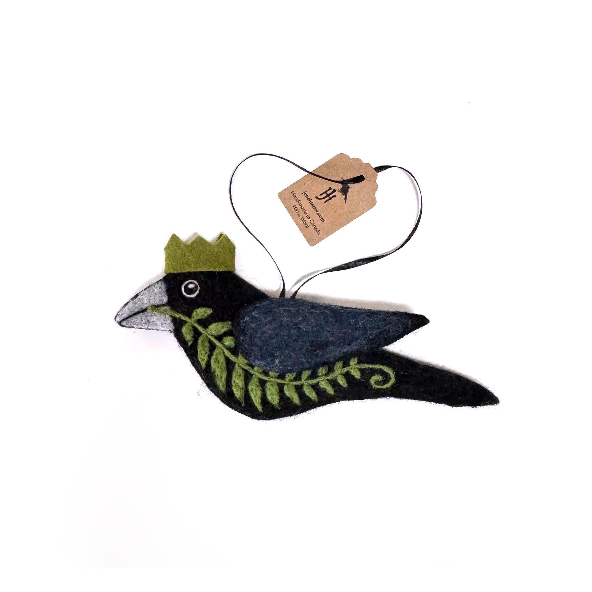 Needle felted crow with festive headgear and trailing fern frond.