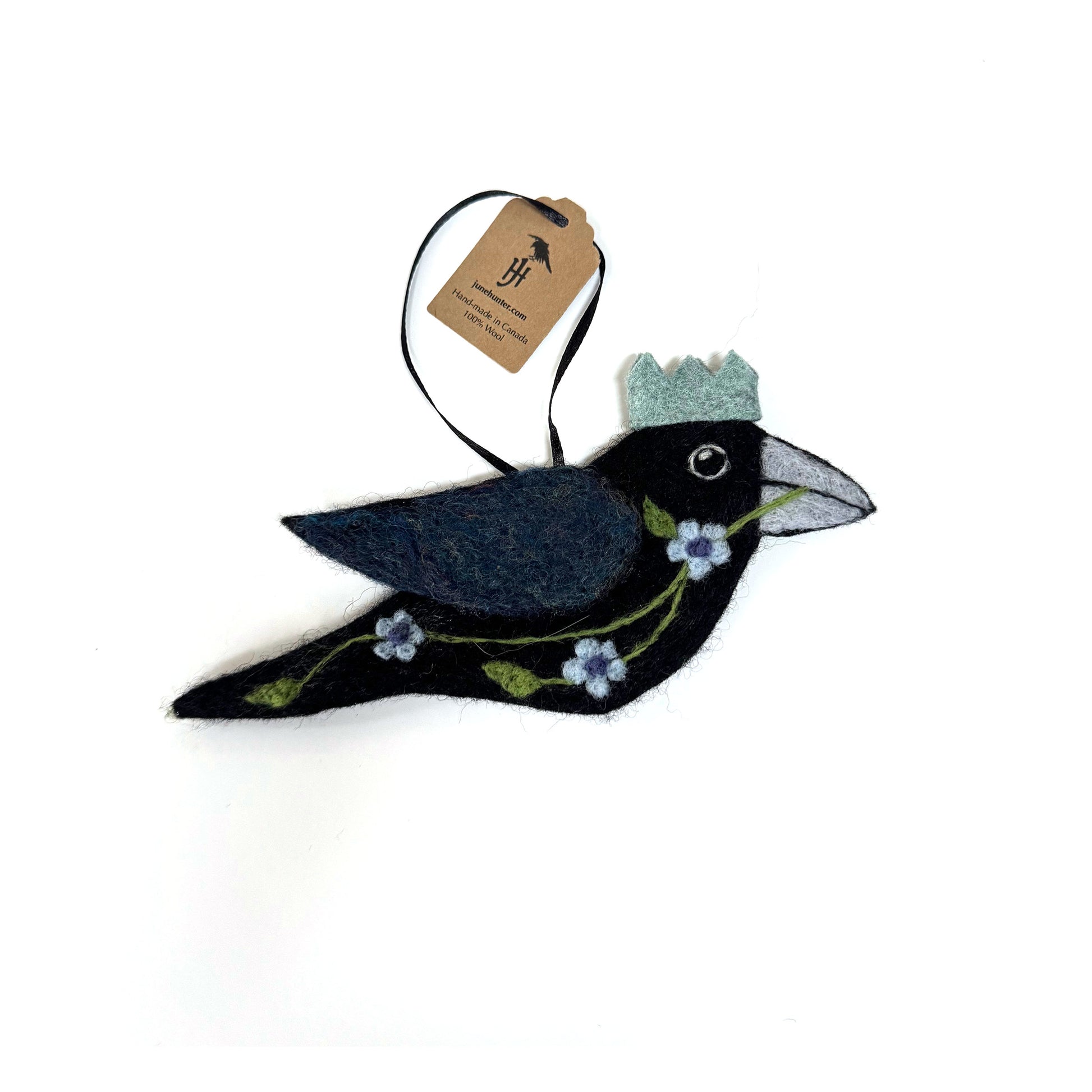 LIGHT BLUE FLOWERS Wool Needle-Felted Crow Hanging