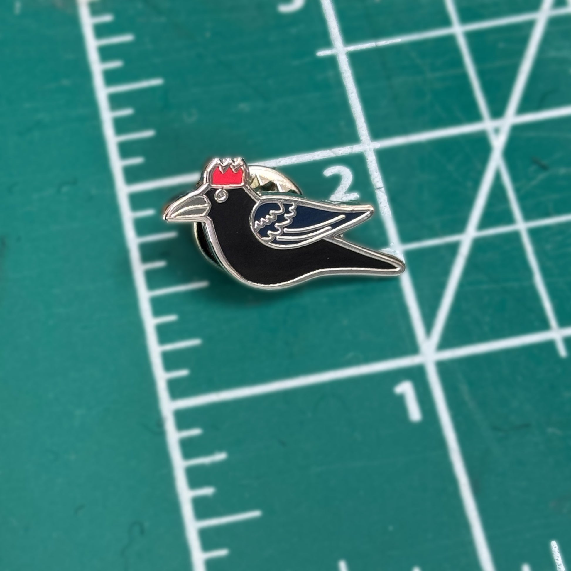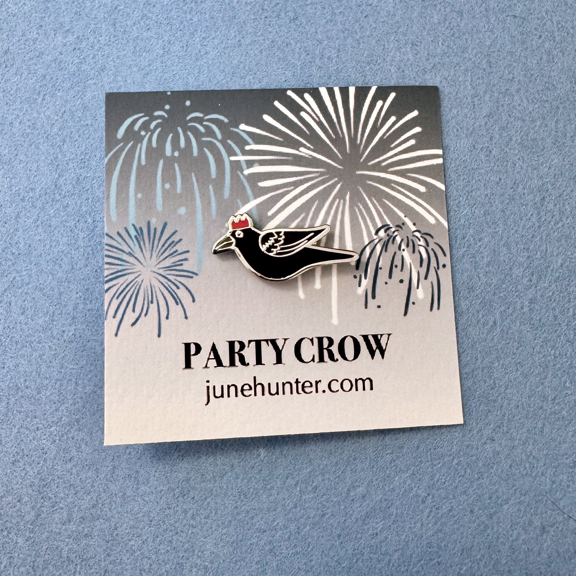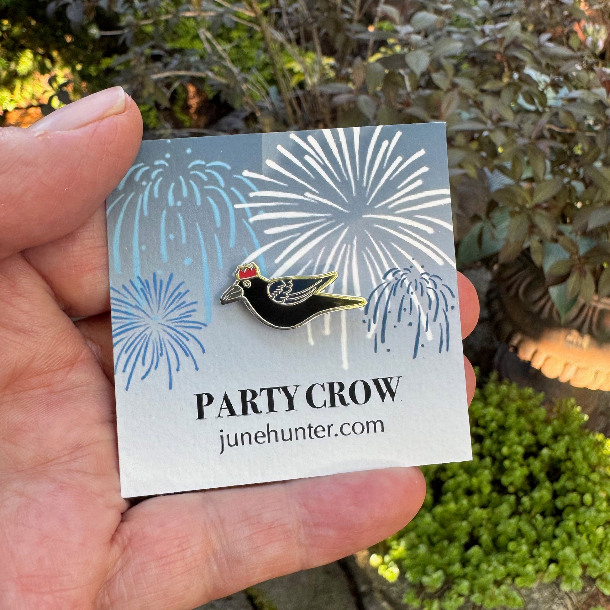 This Party Crow hard enamel pin measures about 1” x 1” (2.5 cm)